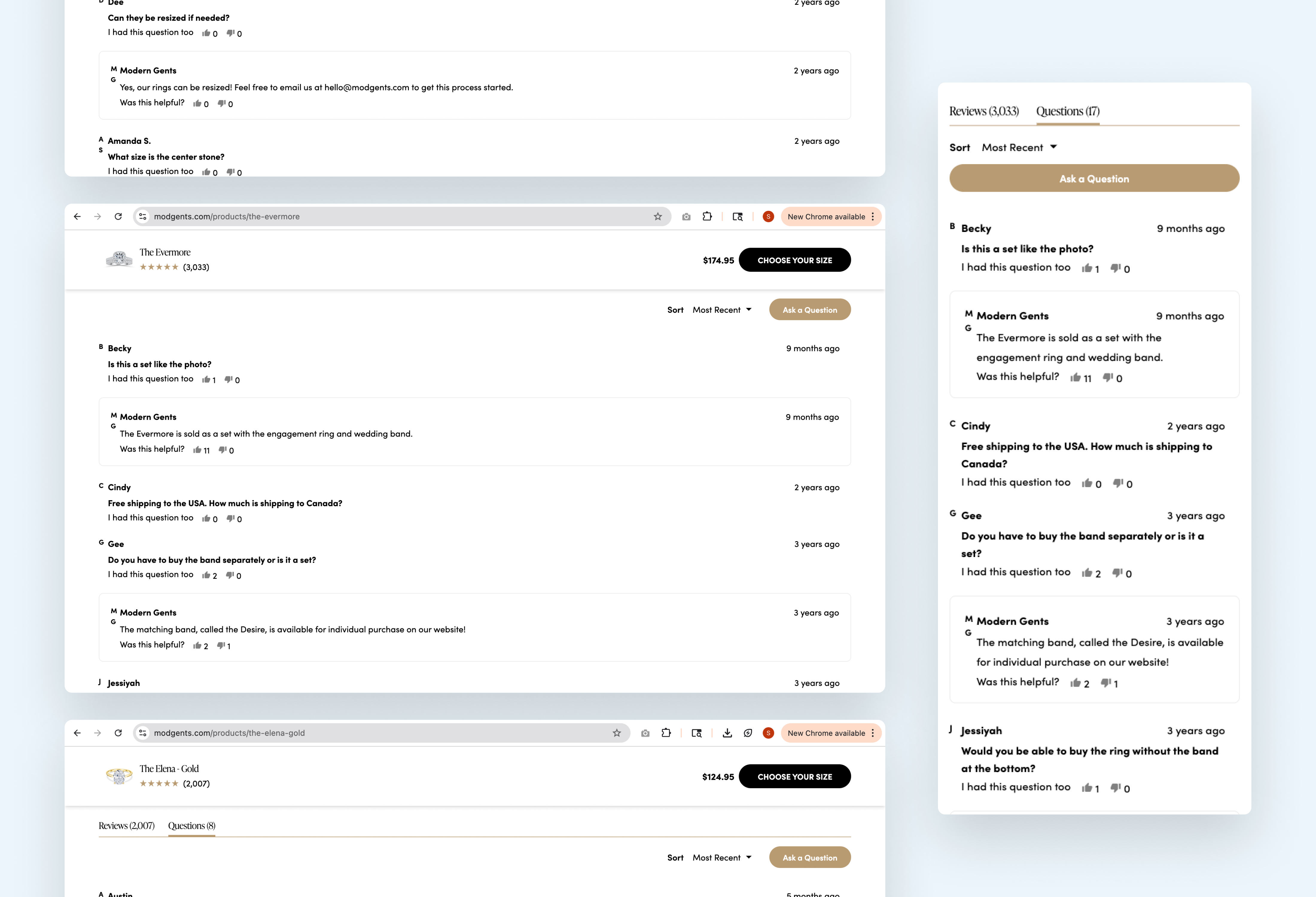 An example of customer questions found on Modgents' PDP pages.