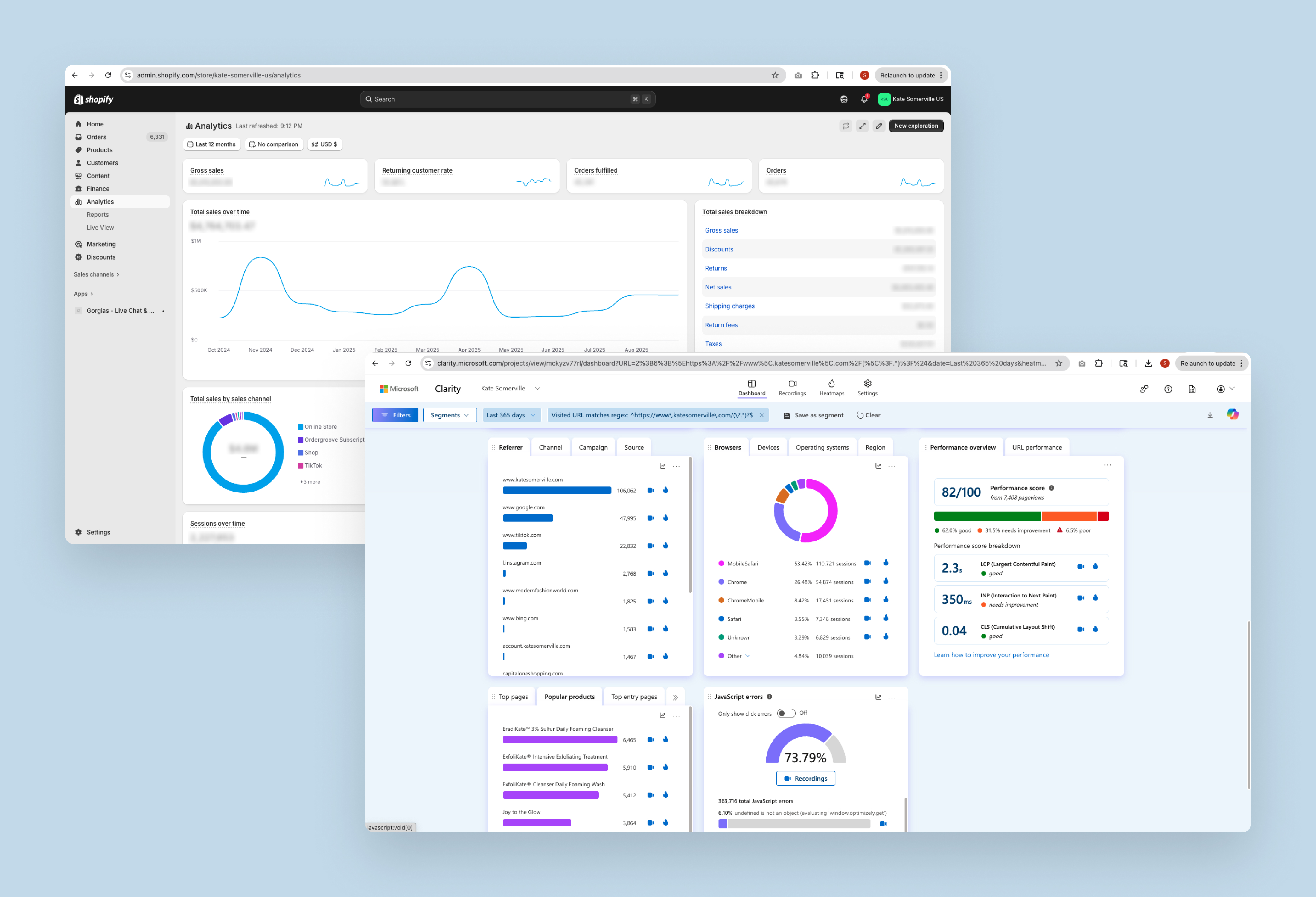 Shopify Analytics & Microsoft Clarity dashboards.
